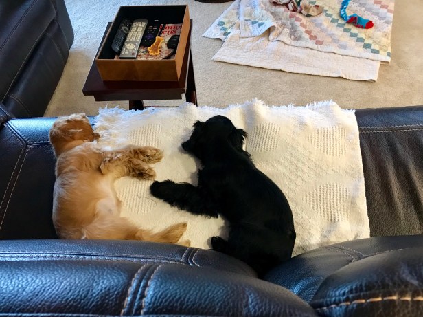 This morning started out way early with our new pups. It’s a great morning workouot for Leroy and I — from little ones greetings of hello, for immediate outside necessities, followed by eating every morsel of food, then outisde again, then finally in with warmth, fun play and naps! Sounds like a perfect schedule for me! Ha