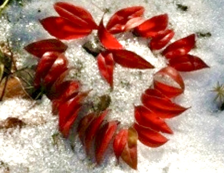 Several years ago, we had a late fall, then an early first snow. I picked up Bradford pear leaves that lay on the ground with nowhere to go! --- and made my Snow Heart, from my hands to your eyes and then to the wind again.